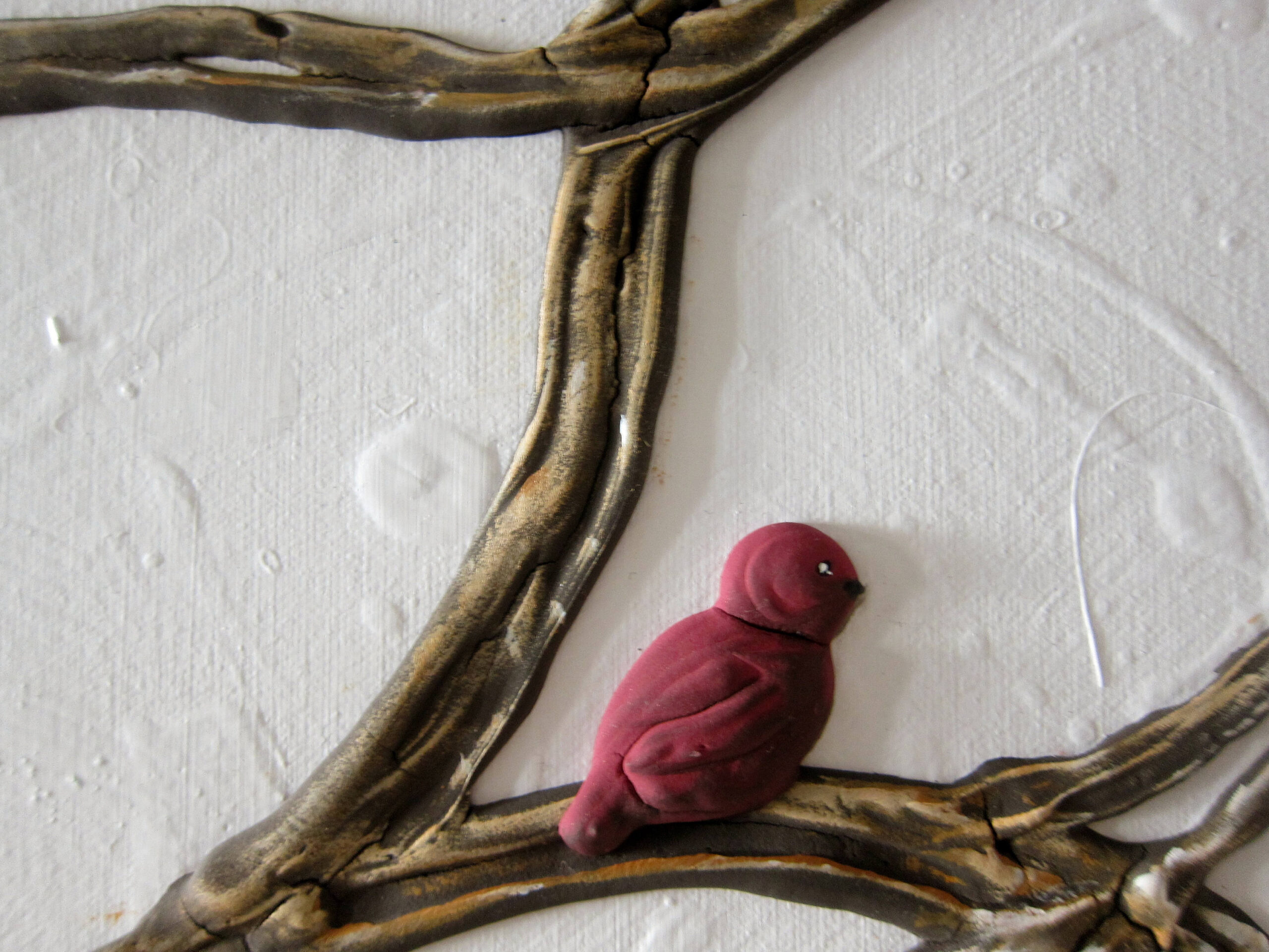 $495.00Titled "Brood of Cardinals" this detailed painting was created with a combination of sculpting and painting. There is a nest of baby cardinals, reminiscent of Angry Birds according to my kids 🙂 and a flying mother bringing her brood a worm. The background of the painting is painted in a beautifully textured white …